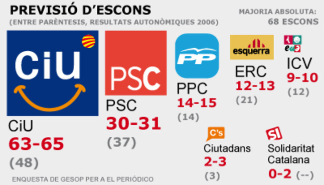 Enquesta feta per GESOP per a El Periodico, que surt en l'edició de demà. Sembla que, segons les enquestes que s'han anat fet, el més interessant serà veure quin seran els partits que formaran part de l'arc parlamentari. Sembla que Ciutadans s'hi queda, que hi ha una lluita entre Reagrupament i SI i no en sabem res de Plataforma per Catalunya.